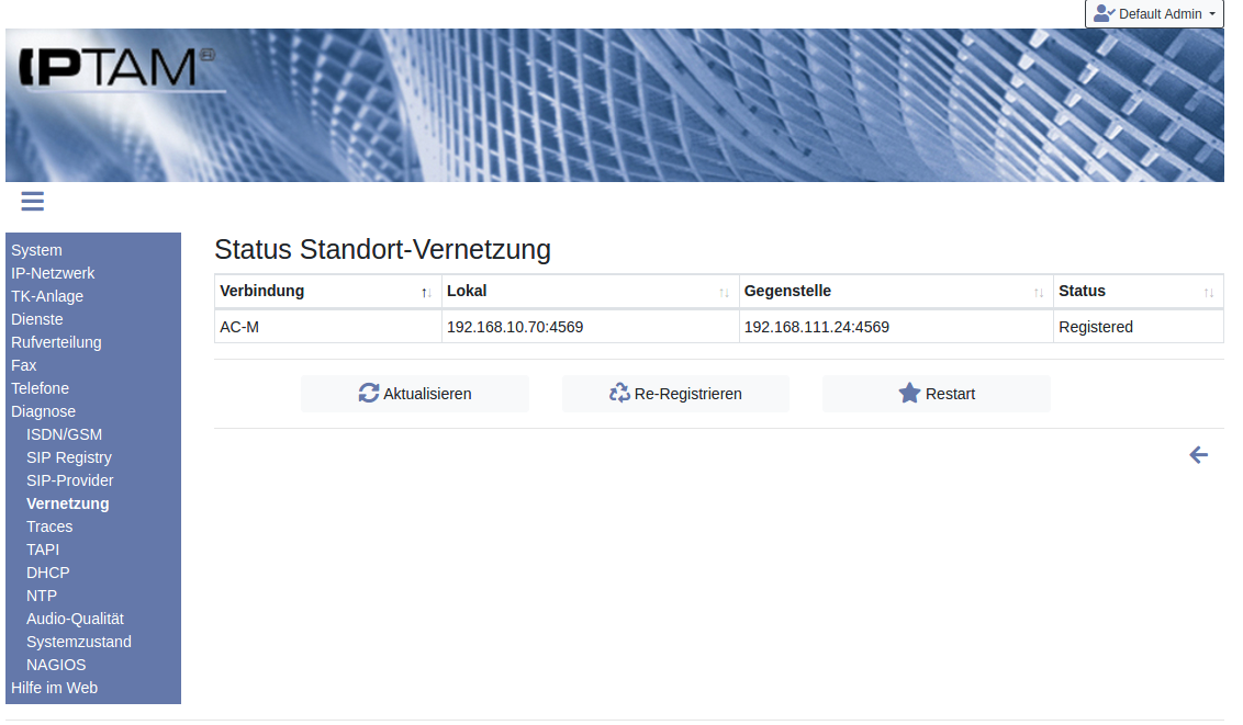 Image Unter Diagnose ► Vernetzung können Sie prüfen, ob die Verbindung zur entfernten IPTAM® PBX erfolgreich aufgebaut wurde. Nach erfolgreichem Verbindungsaufbau wird für die Verbindung der Status „Registered“ angezeigt. Über den Button „ Aktualisieren“ können Sie die Statusanzeige auffrischen. Durch Klick auf den Button „ Re-Registrieren“ wird erneut eine Registrierungsanfrage an die entfernte IPTAM® PBX gesendet. Mit Klick auf den Button „ Restart“ wird die Asterisk neu gestartet. Es erscheint jedoch zunächst nur ein Hinweis auf den Neustart, den Sie durch einen Klick auf den entsprechenden Link ausführen können. Der Link „Bei Inaktivität“ wartet mit dem Neustart bis keine Gespräche mehr geführt werden.