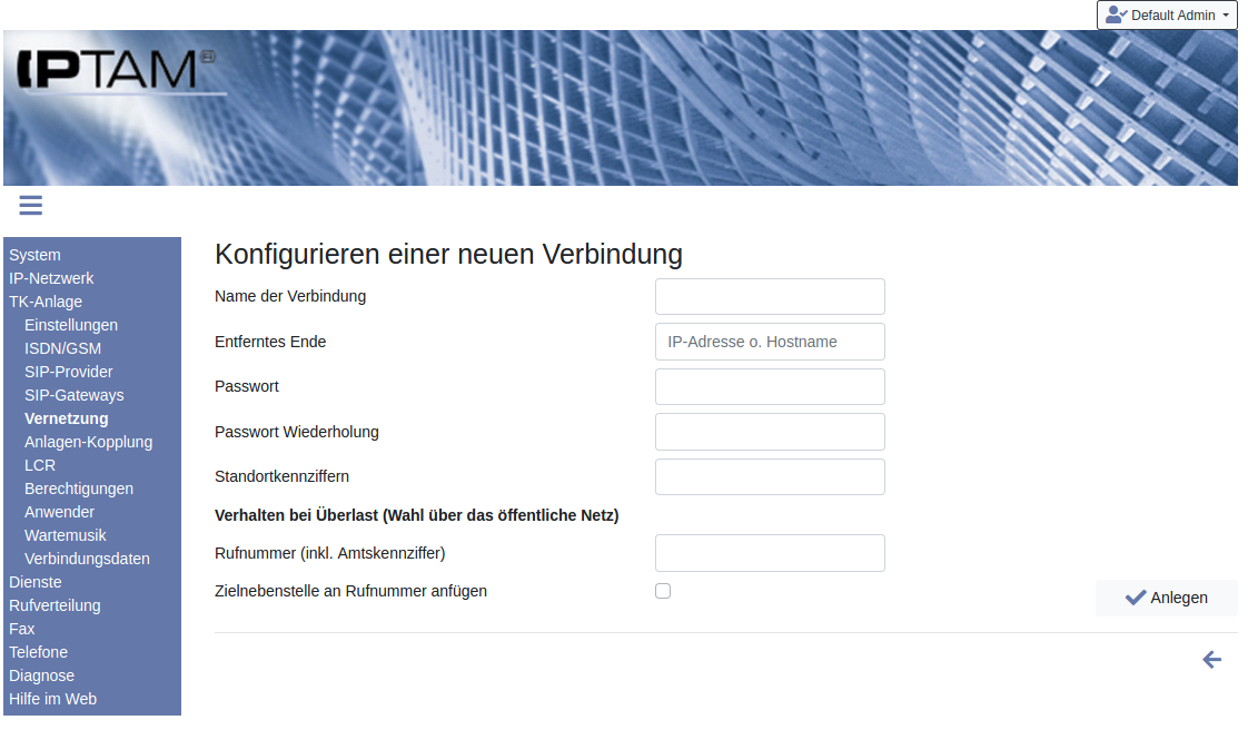 Möchten Sie Kopplungen zwischen IPTAM® PBX und TK-Anlagen anderer Hersteller über SIP einrichten, finden Sie die Einstellungen dazu auf der Seite Kopplung mit anderen TK-Anlagen.