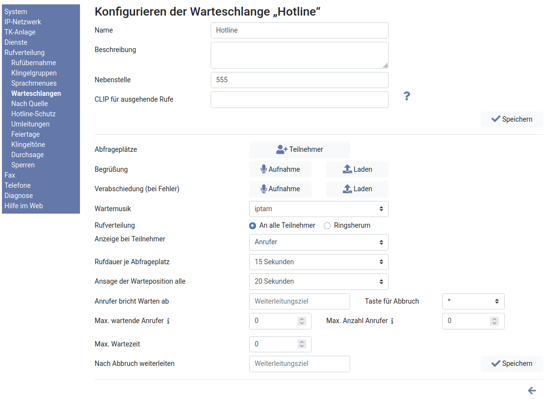 Anrufer an einer Warteschlange hören eine Wartemusik, während bei den zugewiesenen Abfrageplätzen das Telefon klingelt. Zusätzlich zur Wartemusik kann den Anrufern eine Begrüßungsansage und eine Verabschiedungsansage vorgespielt werden. Die Ansagen können über ein Telefon aufgesprochen werden oder als Datei auf die IPTAM® PBX geladen werden.Wenn für eine Warteschlange keine Begrüßungsansage existiert, werden Anrufer direkt auf die Wartemusik geschaltet. Ebenso wird die Verbindung bei einem Fehler direkt getrennt, wenn keine Verabschiedungsansage existiert.