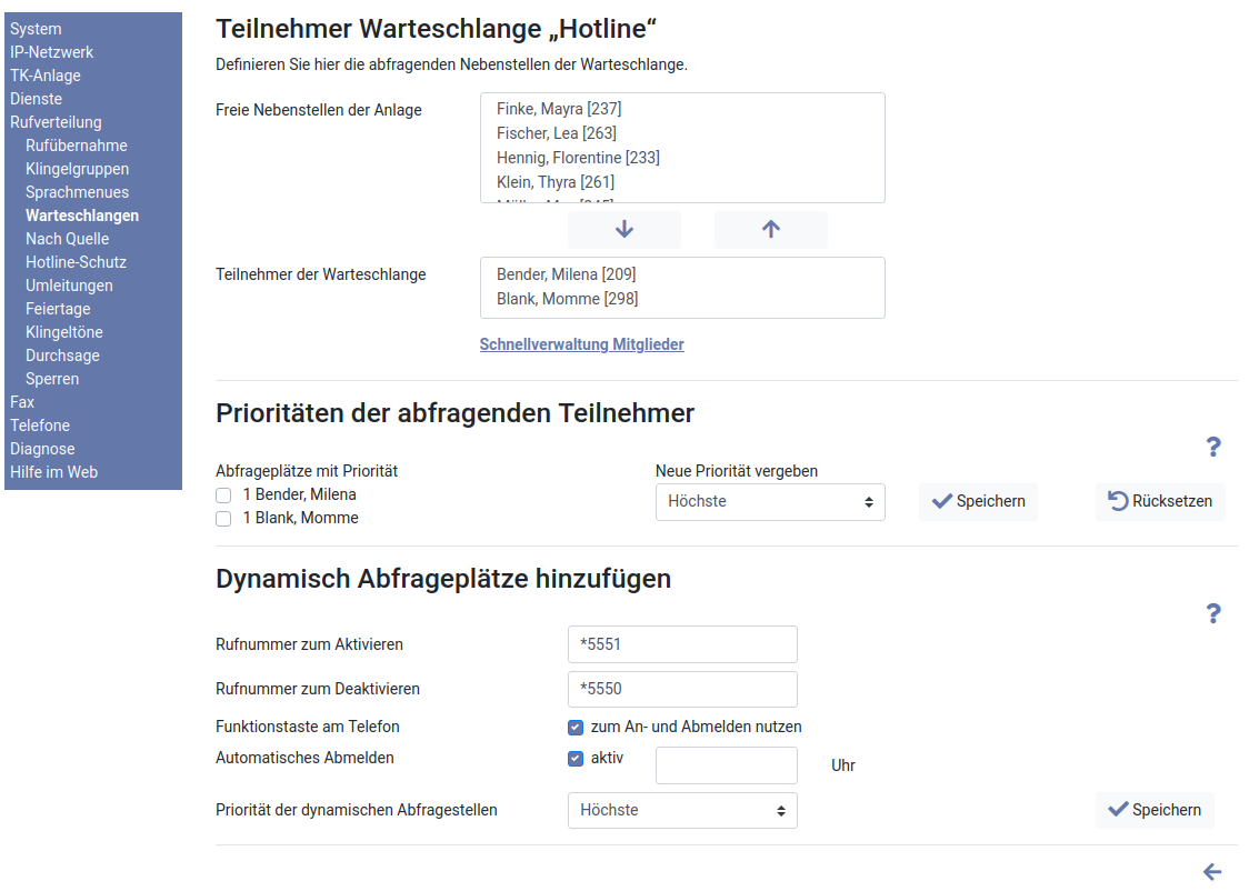 In der Grundeinstellung erhalten alle Abfragepätze die höchste Priorität. Um die Priorität für eine oder mehrere Nebenstellen zu ändern, klicken Sie auf die Checkbox vor dem entsprechenden Namen, wählen über das Auswahlfeld eine neue Priorität aus und klicken auf den Button „ Speichern“. Mit Klick auf den Button „ Rücksetzen“ erhalten alle Teilnehmer wieder die Priorität 1.