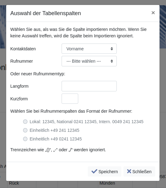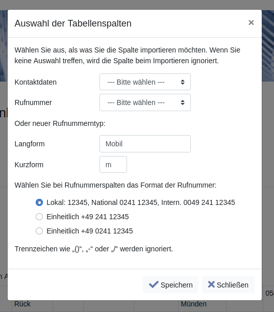 Bei Spalten mit Rufnummern wählen Sie entweder einen vorhandenen Rufnummerntyp aus der Ausklappbox „Rufnummer“ oder tragen einen neuen (wie rechts dargestellt „Mobil“) in die Textfelder ein. Wählen Sie mit Hilfe der Radio-Butons aus, in welchem Rufnummernformat die Rufnummern vorliegen.
