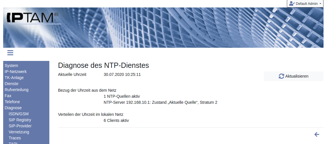 Im unteren Abschnitt sehen Sie, ob Ihre IPTAM® PBX Zeitserver in Ihrem Netz ist. In diesem Fall wird auch angezeigt, wie viele Clients (z.B. IP-Telefone) Kontakt aufgenommen haben.