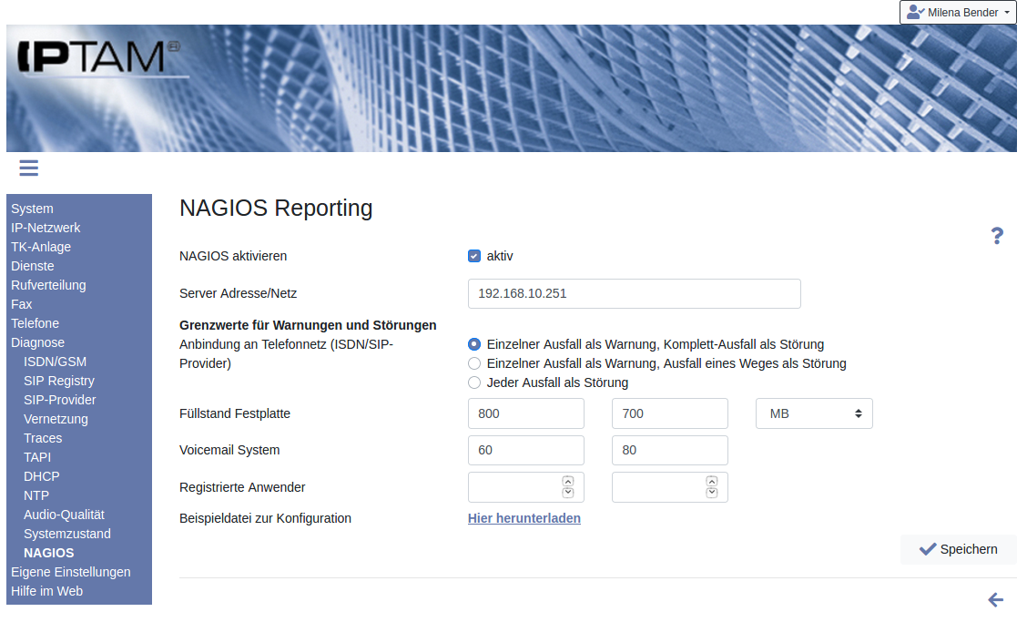 Nagios ist eine Software zur Überwachung (Monitoring) von IT-Infrastruktur. Es werden Netzwerke, einzelne Rechner sowie Dienste auf ihre Verfügbarkeit hin überwacht. Dabei setzt Nagios auf unterschiedliche Tests vom einfachen Prüfen der Erreichbarkeit („Ping“) bis hin zu Testaktionen, die die tatsächliche Arbeitsweise des jeweiligen Dienstes prüfen. Die IPTAM® PBX bietet Schnittstellen an, um die Dienste der Telefonanlage mit Hilfe von Nagios zu überwachen.Konfiguration der Nagios Schnittstelle in der IPTAM® PBX