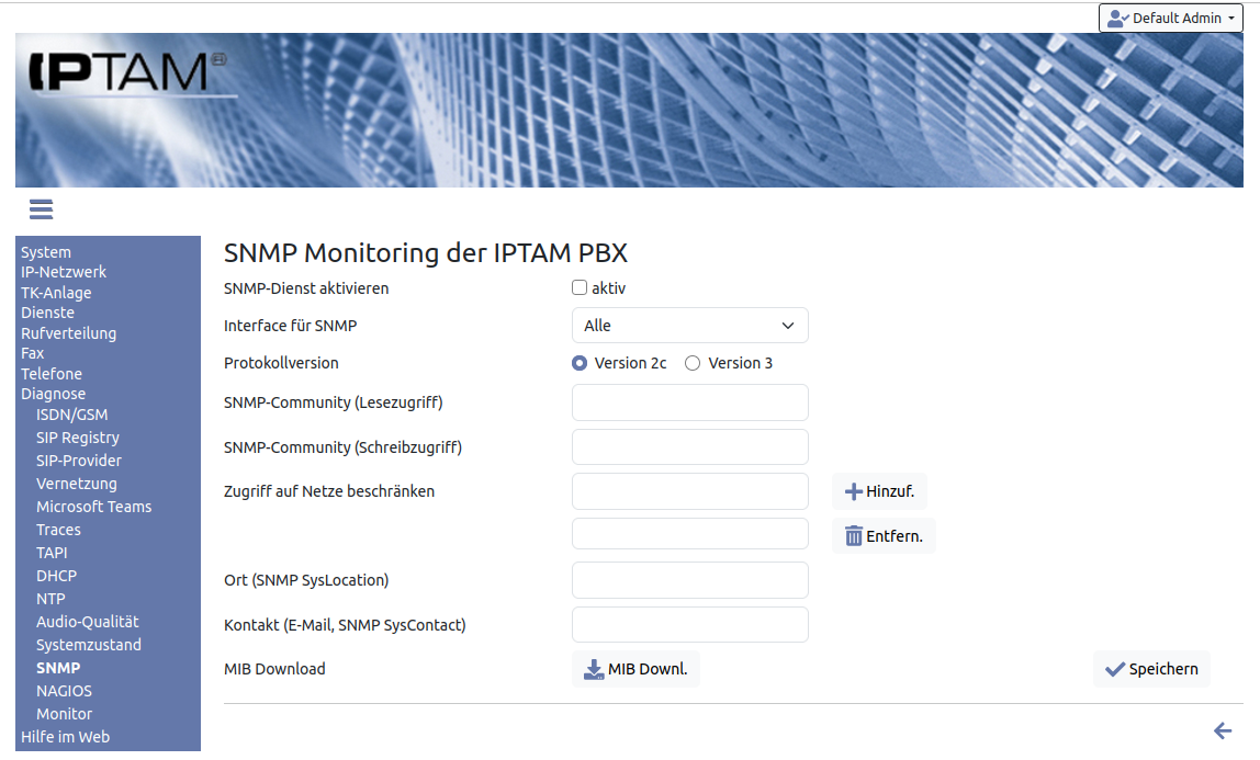 Zu den Standarddaten eines Systems gehören die MIB-Variablen SysLocation und SysContact. Die Daten können Sie in den Feldern „Ort“ und „Kontakt“ eintragen.Die MIB der IPTAM® PBX können Sie über den Button „MIB Download“ herunterladen.