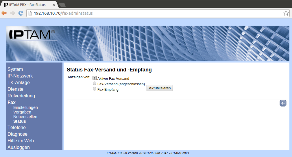 Im Menüpunkt Fax ► Status können Sie die Funktion Ihres Fax-Servers überprüfen. Die Abbildung zeigt den Dialog, in dem Sie wählen können, ob sie den Status des aktiven Fax-Versandes, den Status der versendeten Faxe oder den Status des Fax-Empfangs sehen wollen. Nach einem Klick auf eine der Optionen erhalten Sie eine Listenansicht. Mit Klick auf den Button „Aktualisieren“ wird der aktuelle Status angezeigt.