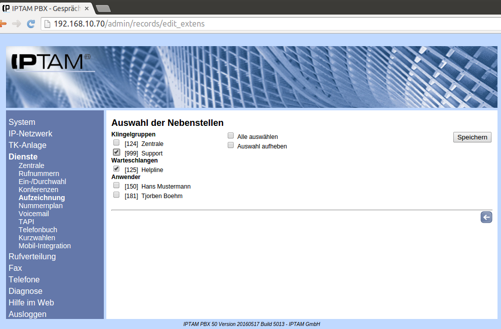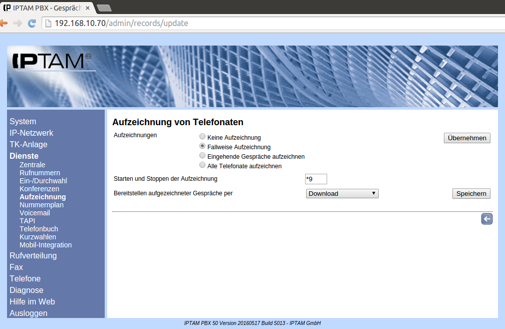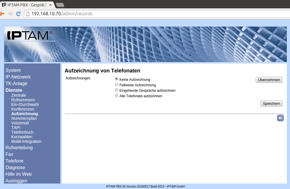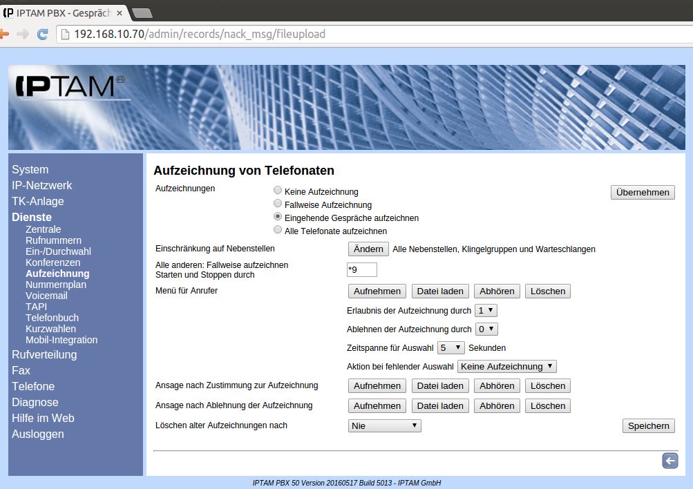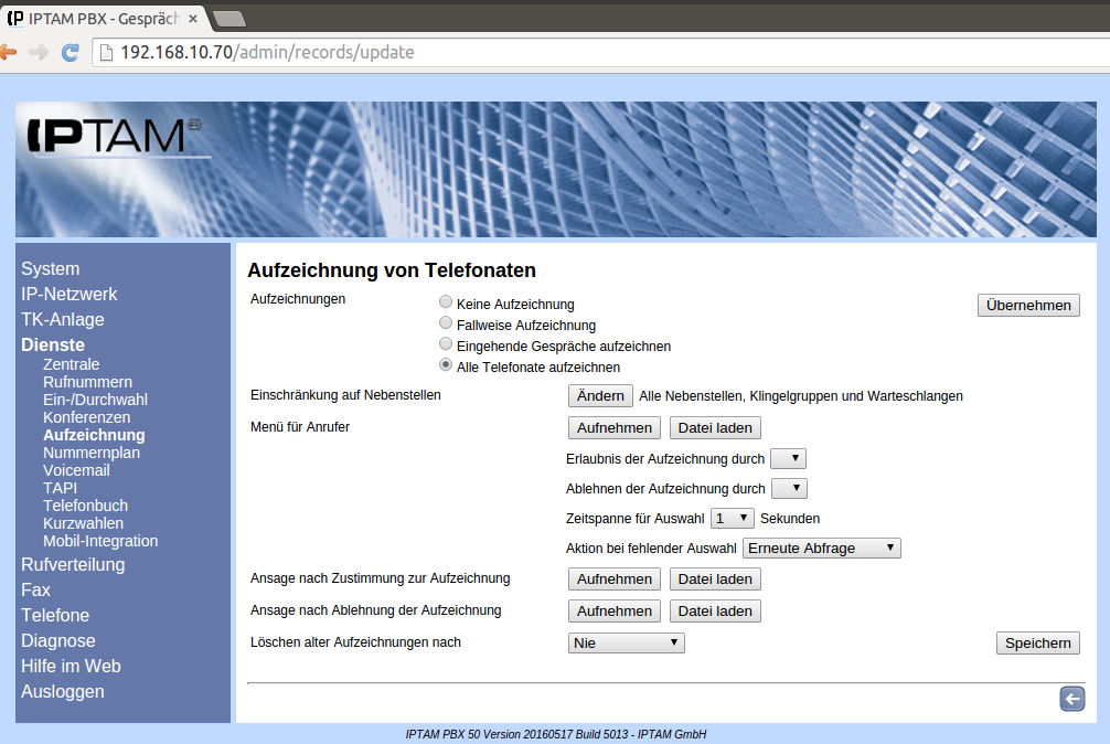 Image Die IPTAM® PBX bietet Ihnen die Möglichkeit, Gespräche mit externen Teilnehmern permanent oder fallweise aufzuzeichnen. Die Einrichtung dieser Aufzeichnung legen Sie im Menü Dienste►Aufzeichnung fest. Im Auslieferungszustand findet keine Gesprächsaufzeichnung statt.