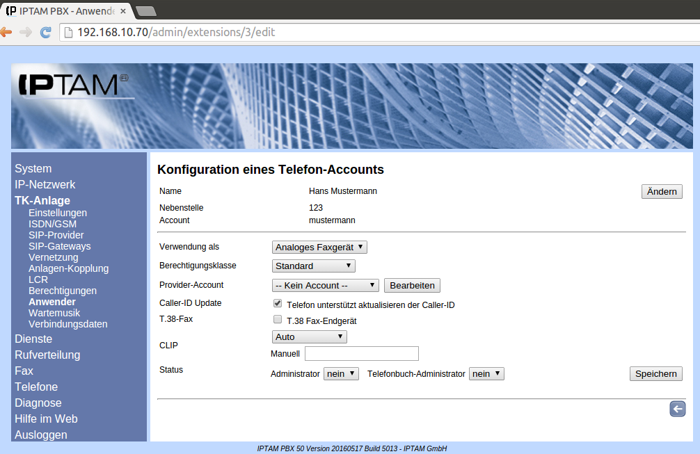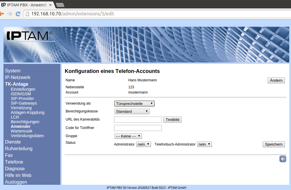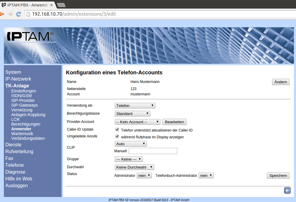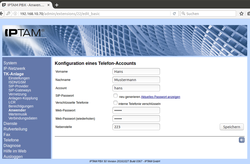 Im Feld „Account“ legen Sie den SIP-Account des Anwenders fest. Mit dem hier einge­tragenen Namen muss sich das Endgerät des Anwenders an der IPTAM® PBX anmelden. Die Anmeldung sollte mit einem Passwort geschützt werden. Das dazugehörende Passwort tragen Sie bei „SIP-Passwort" ein und wiederholen die Eingabe im darauf folgenden Feld. Auch der Zugang des Anwenders zu seinen persönlichen Einstellungen, die er über die Web-Oberfläche vornimmt (Siehe Anwenderhandbuch) kann über ein Passwort gesichert werden. Dieses Passwort kann der Anwender selbst verändern. Im Feld Nebenstelle geben Sie die Nebenstelle ein, unter der der Anwender zu erreichen sein soll. Falls Sie Ihre IPTAM® PBX an einem ISDN Anlagenanschluss oder an einem durchwahlfähigen SIP Anschluss betreiben, ist die Nebenstelle auch gleichzeitig die Durchwahl des Anwenders, über die er von extern er­reichbar ist.