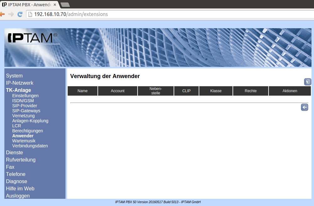 Image Nachdem nun alle vorbereitenden Einstellungen vorgenommen wurden, können Sie die Anwender anlegen. Im Menüpunkt TK-Anlage ► Anwender wird Ihnen die Liste der derzeit angelegten Anwender angezeigt (siehe Abbildung).