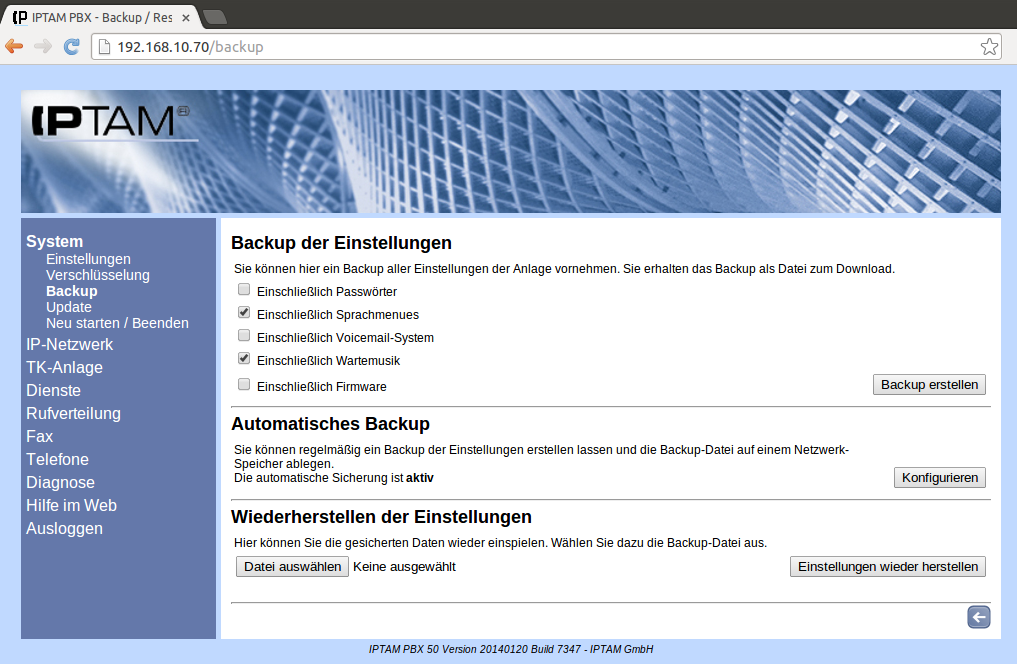 Wenn die Einstellung „Telefonkonfigurationen aktualisieren“ aktiviert ist, werden die Konfigurationsdateien der Telefone anhand der Daten aus dem Backup neu generiert, andernfalls werden die gesicherten Dateien direkt verwendet. Setzen Sie diese Option unbedingt, wenn die IP-Adresse der Anlage sich gegenüber der aus dem Backup geändert hat oder wenn das Backup aus einer früheren Version der IPTAM® PBX stammt. Wenn Sie hingegen manuelle Änderungen an den Dateien vorgenommen haben, sollten Sie die Option nicht setzen. In allen anderen Fällen ist die Einstellung ohne Relevanz, weil die neu generierten Dateien den gesicherten entsprechen.