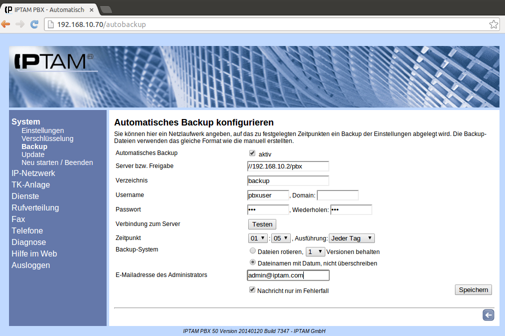 Sie können regelmäßig eine Backup-Datei generieren lassen, die alle oben erwähnten Optionen einschließt, und diese auf einem Netzwerk-Speicher ablegen lassen. Auf diese Weise erhalten Sie regelmäßige Sicherungen der Konfigurationen Ihrer IPTAM® PBX.Bei „Zeitpunkt“ können Sie festlegen, um welche Uhrzeit die Sicherung ausgeführt werden soll. Es empfiehlt sich, die Sicherung außerhalb der Hauptnutzungszeit Ihrer Telefonanlage durchzuführen. Sie können wählen, ob die Sicherung jeden Tag oder an einem bestimmten Wochentag (wöchentliche Sicherung) erfolgen soll.