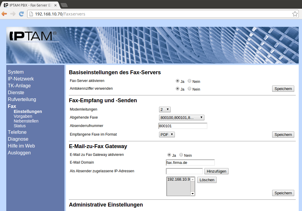 Um diese Funktion zu nutzen, müssen Sie zunächst den Fax-Server konfigurieren und mindestens eine Fax-Nebenstelle einrichten.