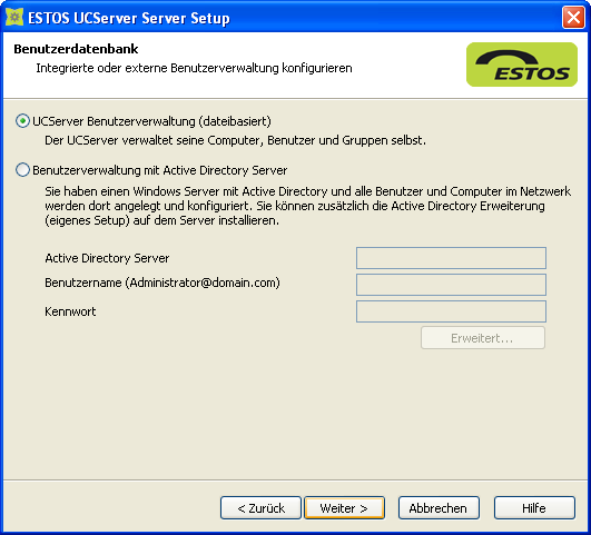 Image Hier wählen Sie, wie Sie die Benutzer der CTI-Anwendung administrieren wollen. Sie können dies über eine interne, dateibasierte Verwaltung tun oder das Active Directory nutzen.