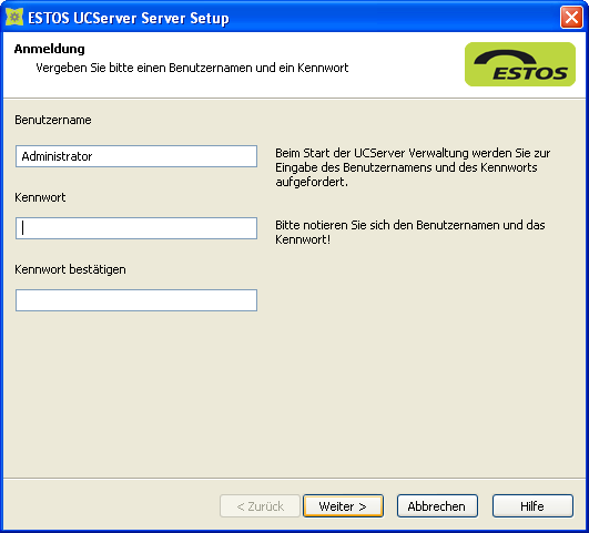Image Geben Sie Benutzername und Kennwort an. Mit diesen Daten melden Sie sich später als Administrator über die Management-Anwendung an, um den CTI-Server zu administrieren.