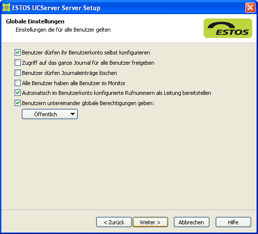 Entpacken Sie das heruntergeladene Archiv in ein temporäres Verzeichnis. Starten Sie die Installation des Servers durch einen Doppelklick auf die Datei „UCServer_de.msi“. Akzeptieren Sie den Lizenztext und wählen Sie ein Installationsverzeichnis. Klicken Sie im nächsten Dialog auf „Fertigstellen“. Daraufhin startet der Setup-Prozess zur weiteren Konfiguration.