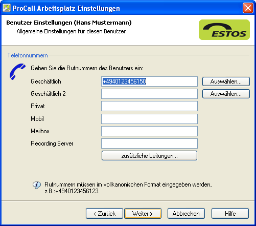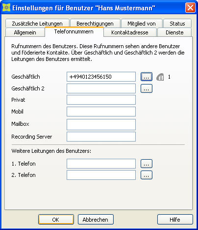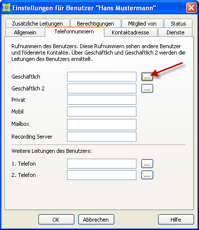 Image Image Es öffnet sich der links dargestellte Dialog, wo Sie die Daten des Anwenders eintragen. Im Reiter „Allgemein“ sind Vor- und Nachname sowie der angezeigte Name und das Passwort wichtig. Im Reiter „Telefonnummern“ tragen Sie die Rufnummer(n) des Anwenders ein. Klicken Sie auf den in der rechten Abbildung markierten Button, um eine Liste der verfügbaren Leitungen (Nebenstellen) zu erhalten. Wählen Sie davon eine aus. Verlassen Sie den Dialog mit "OK".