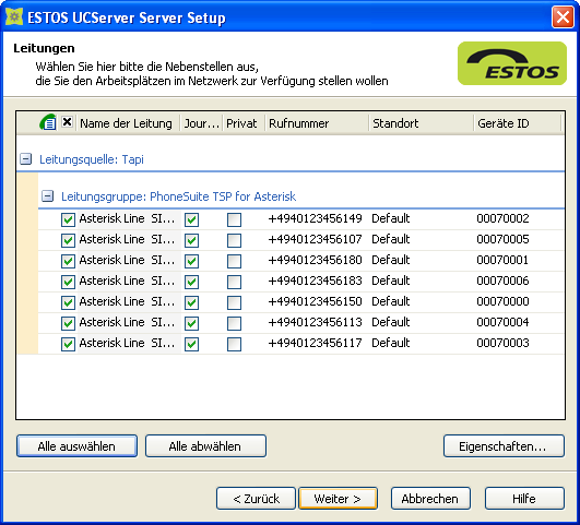 Image Sie finden im nächsten Dialog eine Liste aller TAPI-Leitungen (Nebenstellen Ihrer Telefonanlage). Wählen Sie die Leitungen aus, die durch die CTI-Anwendung genutzt werden sollen. Klicken Sie auf „Weiter“. Sie erhalten nun den abschließenden Hinweis, dass der Setup-Prozess abgeschlossen sei. Sie können nun Ihre Einstellungen in der Management-Anwendung des CTI-Servers anpassen sowie Ihre CTI-Clients installieren und konfigurieren. Klicken Sie auf „Fertig stellen“.
