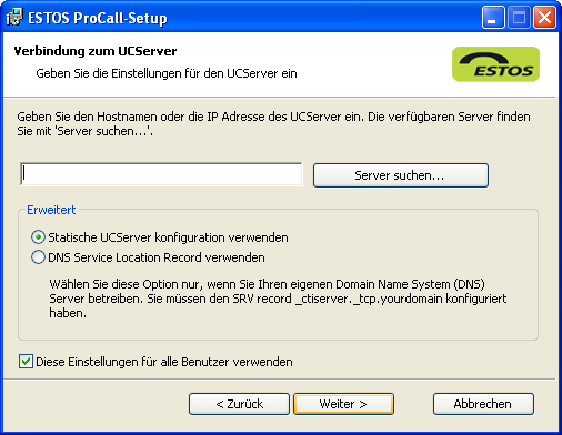 Image Im nächsten Dialog geben Sie Namen oder IP-Adresse des CTI-Servers an. Sie können den Server auch über den Button „Server suchen“ lokalisieren. Klicken Sie anschließend auf „Weiter“.