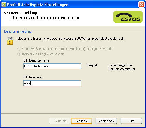 Image Tragen Sie Name und Kennwort ein und klicken Sie auf „Weiter“. Wenn der Anwender am CTI-Server noch nicht eingerichtet wurde, besteht jetzt die Möglichkeit, sich als Administrator anzumelden und die Einrichtung am Server vorzunehmen.