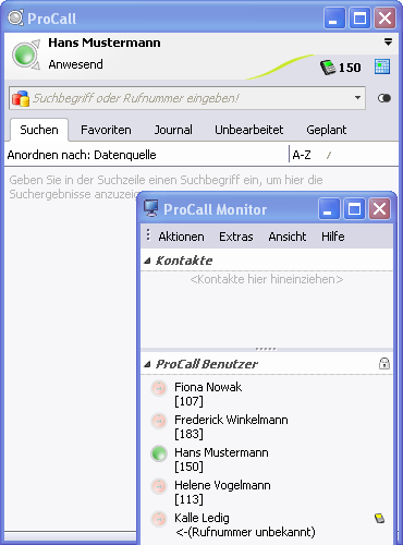 Image Die nebenstende Abbildung zeigt den CTI-Client mit aktiviertem Monitor-Fenster. Das Fenster kann auch seitlich am Monitor eingerastet werden. Ob Sie im Monitor die Rufnummer von aktiven Gesprächen anderer Teilnehmer oder nur ein „Unbekannt“ (wie in der Abbildung) sehen, hängt von den Berechtigungen ab, die Sie konfigurieren können.