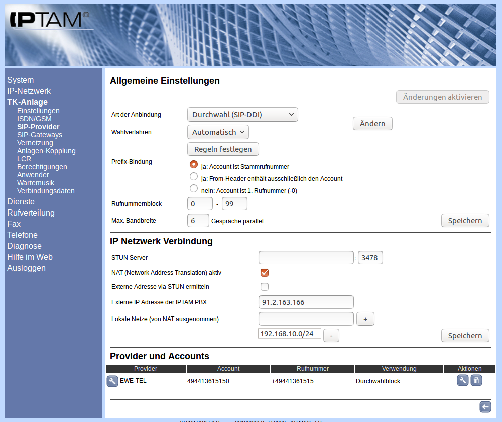 In der Regel wird Ihr Router eine feste externe IP-Adresse besitzen und mittels NAT (Network Address Translation) die Verbindung zum internen Netz herstellen. Tragen Sie dann im Abschnitt „IP Netzwerk Verbindung“ diese Adresse ein und setzen Sie die Checkbox „NAT“. Falls Ihr Anschluss über eine dynamische IP-Adresse verfügt, tragen Sie einen Dyn-DNS-Namen anstelle der IP-Adresse ein oder verwenden Sie einen STUN-Server und setzen Sie zusätzlich die Checkbox bei „Externe Adresse via STUN ermitteln“. Ihre IPTAM® PBX wird Änderungen der öffentlichen Adresse automatisch erkennen und eine Neu-Registrierung ausführen.