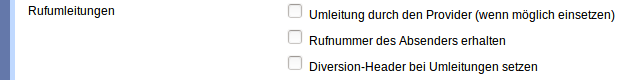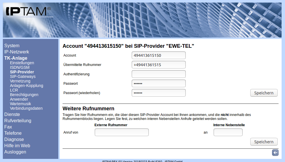 Für die Behandlung von Rufumleitungen (permanent, zeitgesteuert, bei Nichterreichbarkeit, bei Besetzt) bietet die Kombination von EWE TEL und Ihrer IPTAM® PBX mehrere Optionen. Bei den oben dargestellten Einstellungen sorgt die IPTAM® PBX dafür, dass die Umleitung im Netz Ihres Providers ausgeführt wird. Das umgeleitete Gespräch belegt keine Ressourcen auf Ihrem Internet-Zugang und in der IPTAM@ PBX. Der Angerufene sieht die Rufnummer des Anrufers.Account einrichten