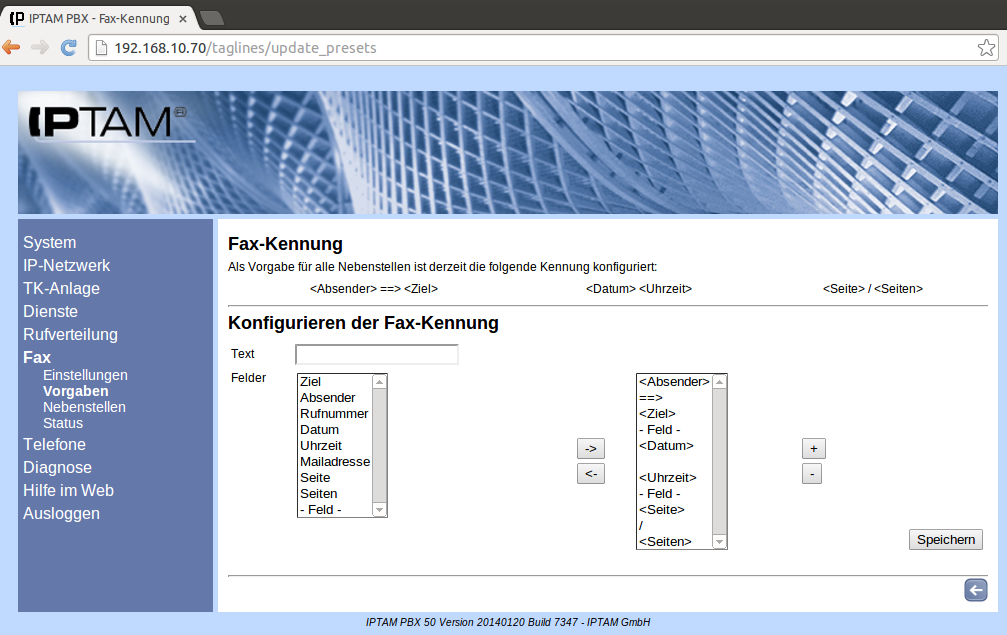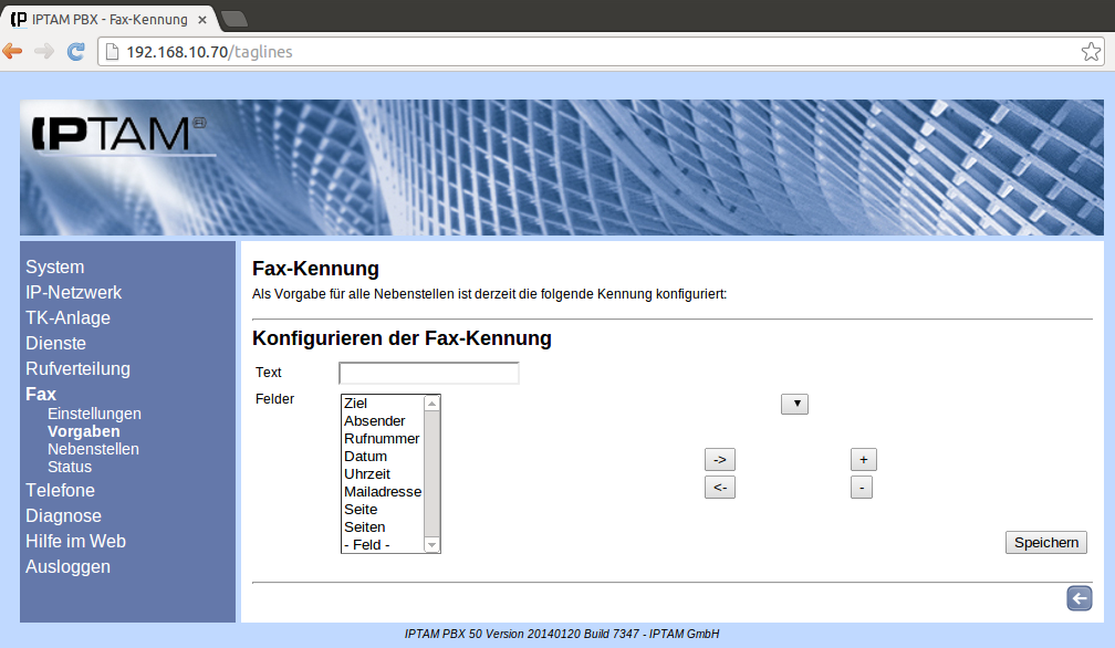 Durch Einfügen des Elementes „-Feld-“ fügen sie einen senkrechten Trennstrich zur Abgrenzung der einzelnen Elemente in die Fax-Kennung ein. Diese Feld-Abgrenzung wird in der Faxzeile zum gleichmäßigen Verteilen der dadurch getrennten Bereiche verwendet. Wenn Sie z.B. die Zeile durch zwei „Feld“-Einträge in drei Bereiche teilen, erscheint einer links, einer rechtsbündig und der mittlere in der Mitte zentriert innerhalb der Kopfzeile. Nachdem Sie die Elemente Ihrer Kopfzeile zusammengestellt haben, sichern Sie die Einstellung über den Button „Speichern“. Ein Beispiel einer ausgefüllten Fax-Kennung sehen Sie in der Abbildung rechts.