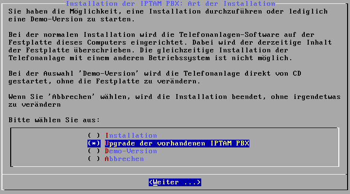 Mit den Cursortasten der Tastatur wählen Sie aus, ob sie die Software installieren möch­ten, eine Demo der Anlage von ohne Installation starten möchten, ein Upgrade einer vorhandene IPTAM® PBX auf eine größere Lizenz durchführen möchten oder die Installation abbrechen möchten.
