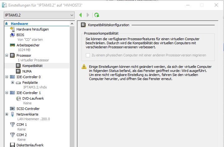 Die aktuelle IPTAM PBX® Version 3.2 hat ein bekanntes Problem, wenn der VM-Host ein aktuelles Modell der XEON® Familie verwendet. Das äußert sich so, dass beim Speichern einer Einstellung in der Web-Oberfläche der IPTAM PBX ein „Interner Fehler“ gemeldet wird und ein System-Dienst anschließend nicht mehr läuft.Lösung für Microsoft Hyper-V