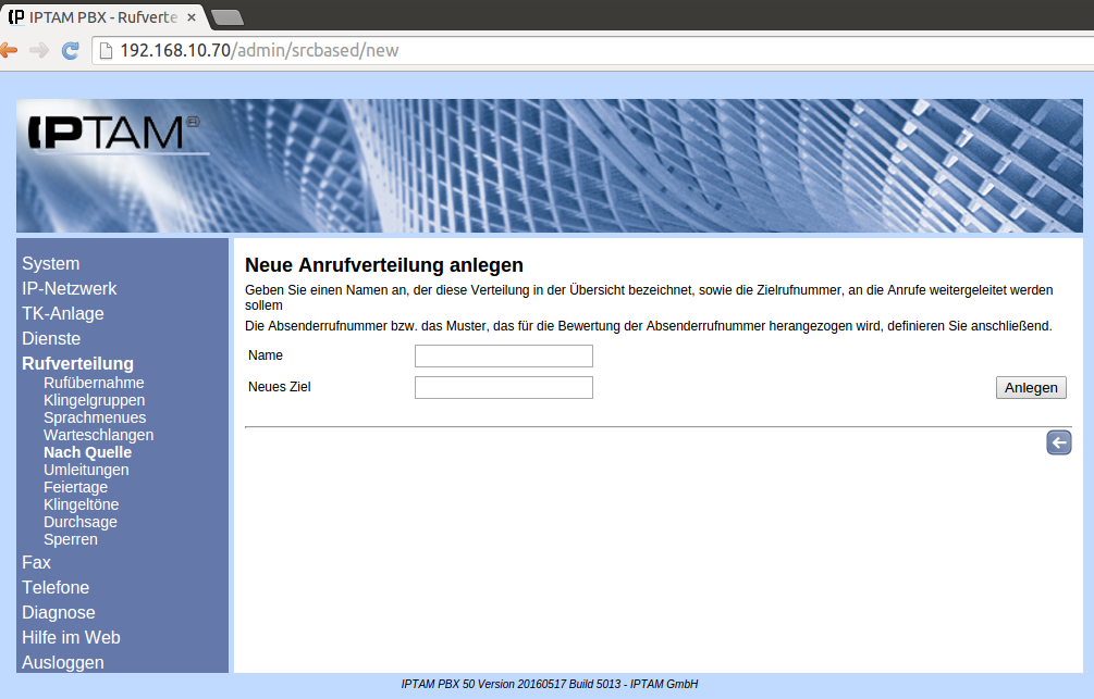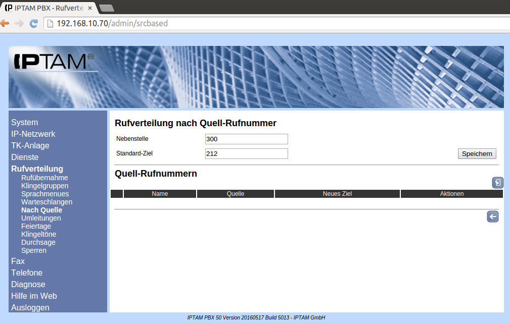 Die IPTAM® PBX bietet Ihnen die Möglichkeit, Rufumleitungen abhängig von der Absender-Rufnummer einzurichten. Im Menüpunkt Rufverteilung ► Nach Quelle richten Sie ein, für welche Nebenstelle eine solche Umleitung konfiguriert werden soll. Sie können diese Funktion z.B. nutzen, wenn Sie Ihren Kunden eine einheitliche Rufnummer für den Vertrieb anbieten wollen, diese jedoch intern zu regionalen Vertriebsbüros umleiten möchten. Ein weiteres Einsatzbeispiel ist eine Hotline, bei der Anrufe aus dem Ausland an Mitarbeiter mit entsprechenden Sprachkenntnissen geleitet werden.