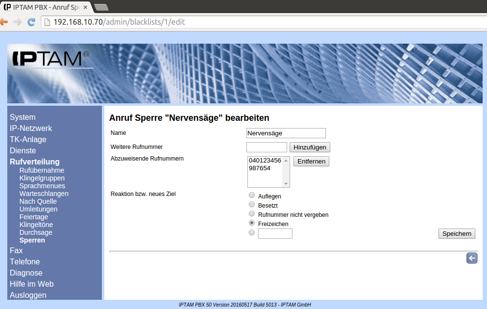 Die IPTAM® PBX unterstützt Sie beim Abweisen oder Umleiten von Anrufern anhand Ihrer Absenderrufnummer. Anders als bei der Verteilung nach Quelle, wo es um Anrufe an eine Nebenstelle und deren Verteilung geht, werden hier alle Anrufer an die Telefonanlage betrachtet.