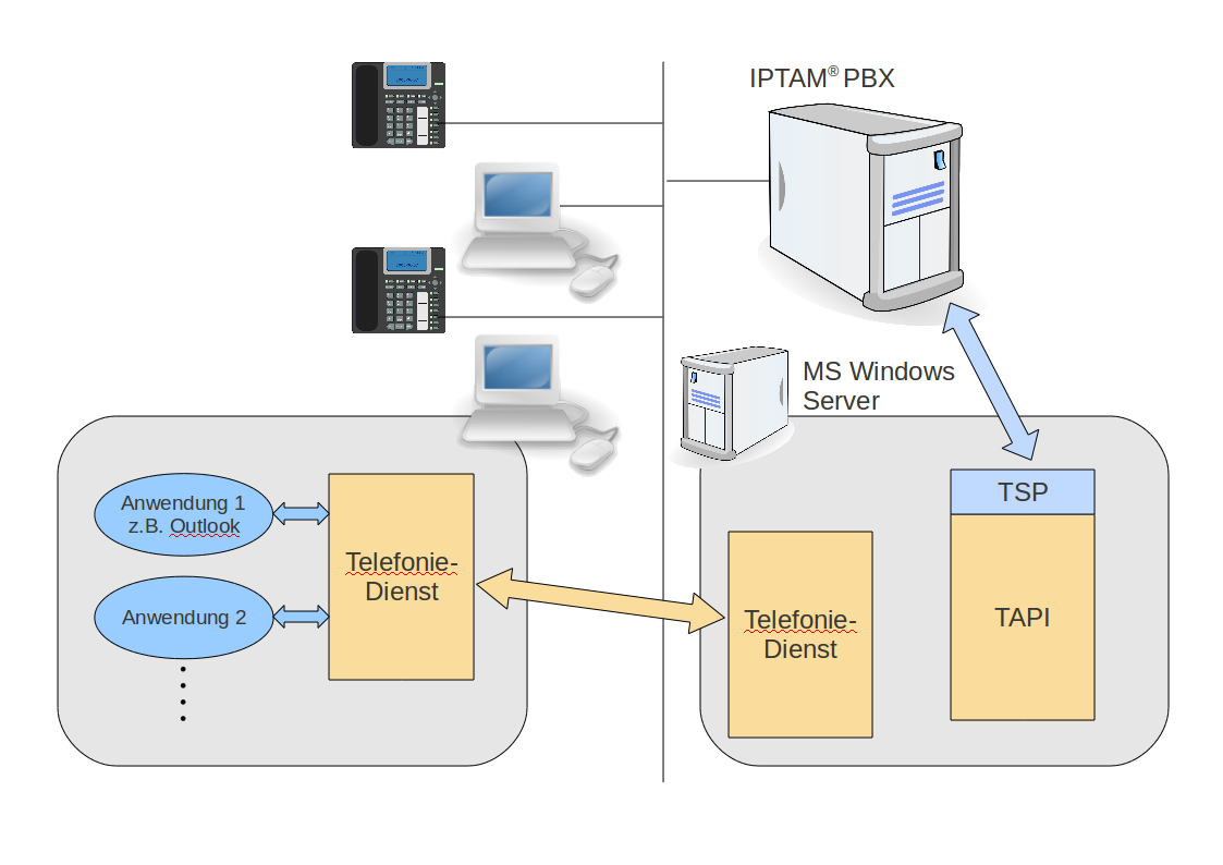 - Die Windows-Clients nutzen das Microsoft Client-Server Modell für Telefonie. Ein Windows-Server unterhält die Verbindung zur IPTAM® PBX .