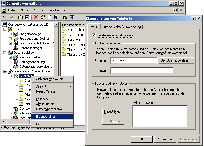Aktivieren Sie zunächst den Telefoniedienst auf Ihrem Server. Starten Sie dazu die Computerverwaltung und gehen Sie zu „Dienste und Anwendungen“. Durch einen Rechtsklick auf „Telefonie“ gelangen Sie zum „Eigenschaften“-Dialog.