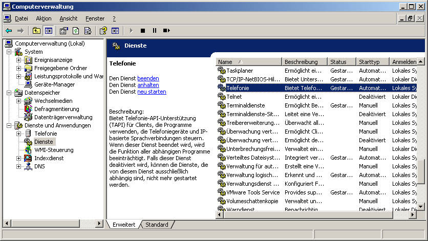 Gehen Sie nun wieder in die Computerverwaltung. Wechseln Sie zu den „Diensten“ unter „Dienste und Anwendungen“ und starten Sie den Telefoniedienst neu.