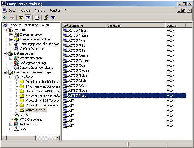 Nach dem Neustart erweitern Sie den Eintrag „Telefonie“ unter „Dienste und Anwendungen“ und klicken Sie dann auf „ActivaTSP“. Sie finden nun rechts eine Liste Ihrer Telefonnebenstellen.