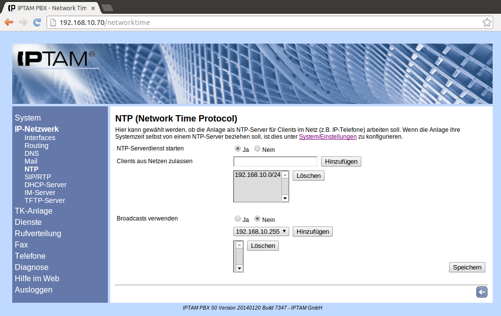Die IP-Telefone in Ihrem Netzwerk beziehen die Uhrzeit, die sie in ihrem Display anzeigen üblicherweise über das Network Time Protocol von einem NTP Server. Ihre IPTAM® IP-Telefonanlage kann die Rolle des NTP-Servers in Ihrem Netz übernehmen. Im Menü IP-Netzwerk ►NTP nehmen Sie die entsprechenden Einstellungen vor. Um den Dienst zu starten wählen Sie beim Eintrag „NTP-Serverdienst starten“ den Button „Ja“.