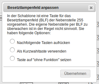 Schablone kann ab Version 3.2 auch das Besetztlamptenfeld (BLF) vorbesetzt werden. Wenn beim Zuordnen einer Schablone zu einem Telefon festgestellt wird, dass die eigene Nebenstelle als BLF konfiguriert ist, erscheint eine Dialogbox (siehe Abbildung rechts). Sie haben die Möglichkeit die betreffende Taste zunächst auf „Ohne Funktion“ zu setzen oder die Taste als Zielwahl für die eigene Nebenstelle zu konfigurieren. Das ist z.B. sinnvoll, wenn auf der Nebenstelle neben einem Tischtelefon ein DECT-Telefon registriert ist. Als dritte Option können die auf die BLF-Taste folgenden Tastenkonfigurationen aufrücken.