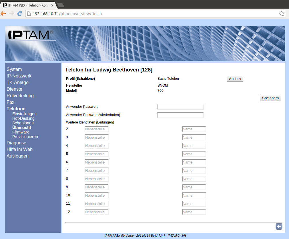 Telefone ► Einstellungen vorgesehen haben, dass die Web-Oberfläche der Telefone mit individuellen Passwörtern für Anwender oder Administrator geschützt wird, legen Sie in der folgenden Maske diese Passwörter fest. In der Abbildung ist das für das Anwender-Passwort der Fall. Darüber hinaus können Sie festlegen, ob sich das Telefon dieses Anwenders mit weiteren Identitäten an der IPTAM