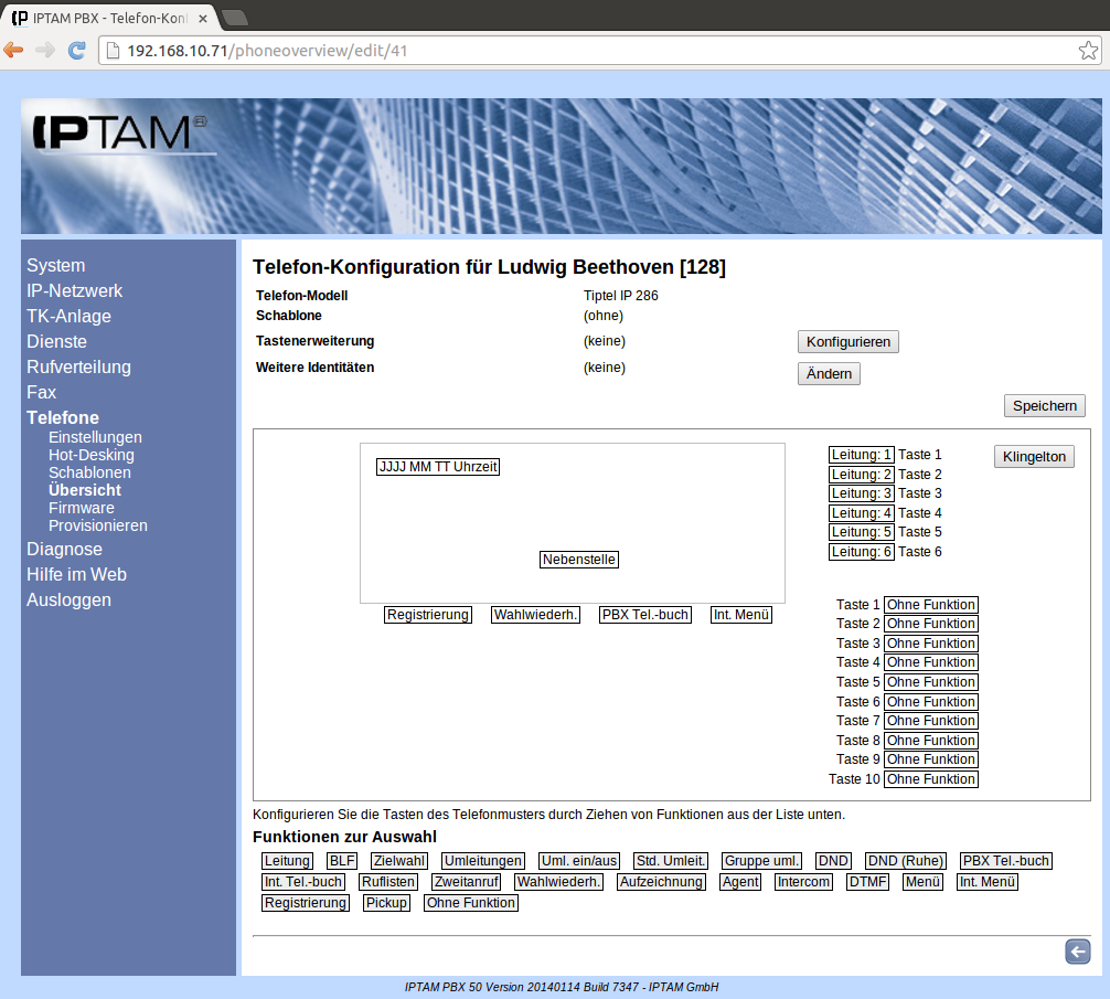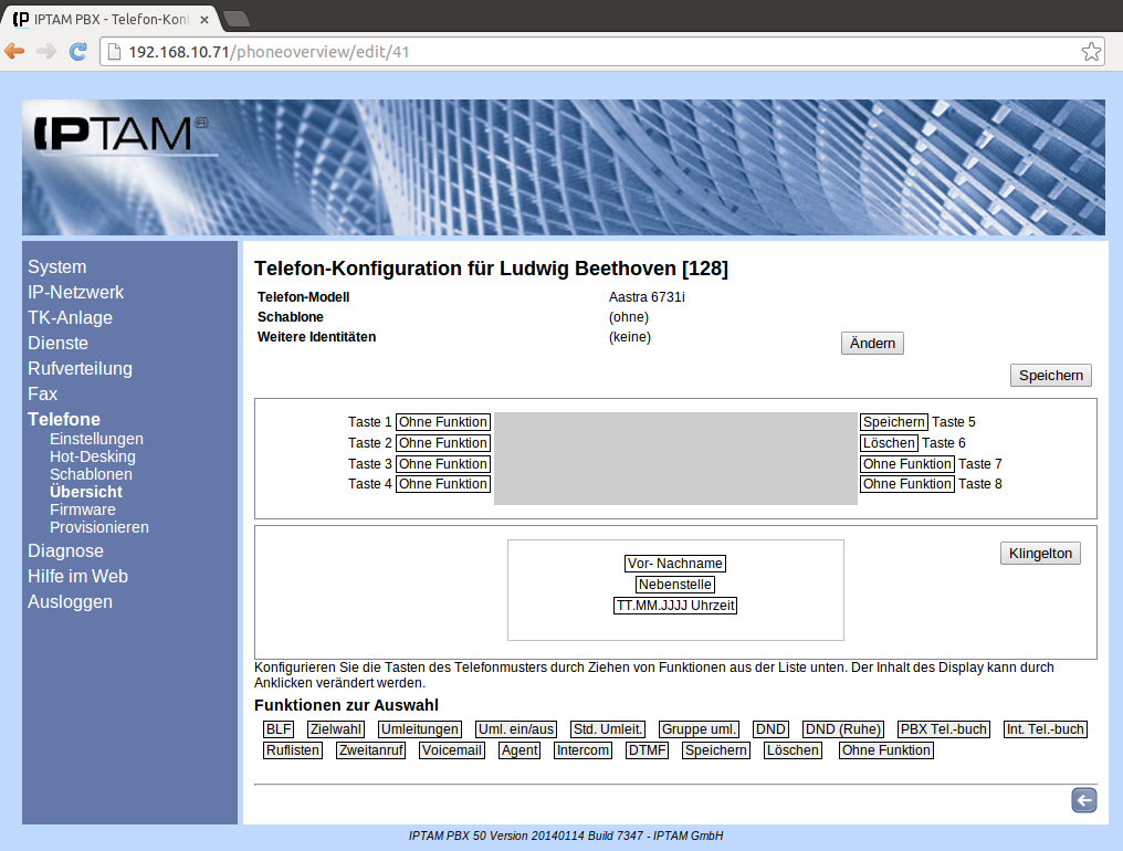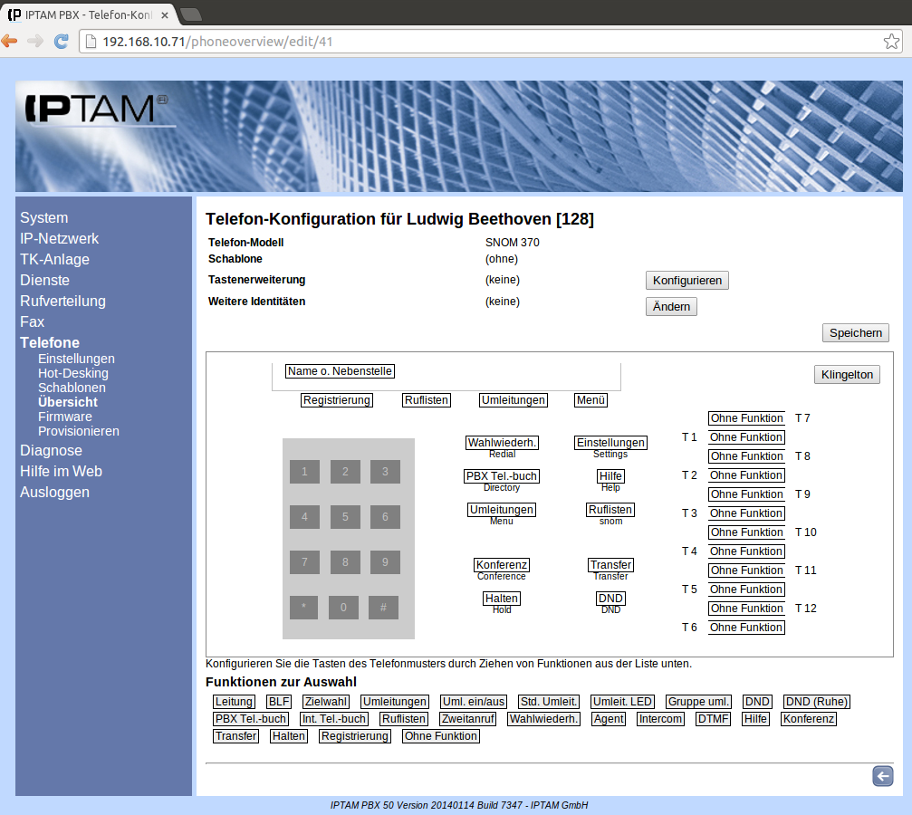 In den Abbildungen ist beispielhaft ein Aastra 6731, ein Gigaset DE700 IP Pro, ein Snom 370 und ein Tiptel IP 286 gezeigt. Sie sehen jeweils stilisiert die Tastenanordnungen. Um den Tasten eine Funktion zuzuweisen, wählen Sie den entsprechenden Button aus der unteren Liste aus und ziehen ihn per Drag & Drop auf die ausgewählte Taste. Wollen Sie die Belegung ändern, ziehen Sie einfach die neue Funktion auf die Taste. Möchten Sie eine Funktion wieder löschen, ziehen Sie den Button „Ohne Funktion“ auf die entsprechende Taste.
