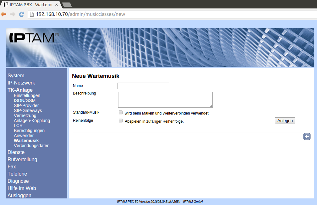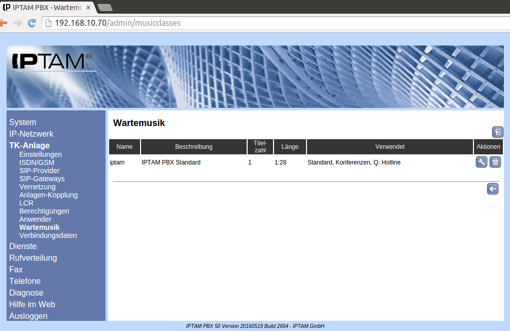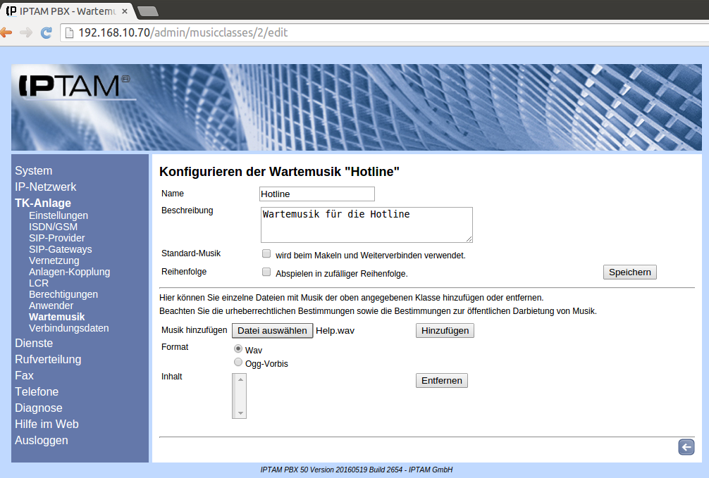 Image Im Menü TK-Anlage ► Wartemusik haben Sie die Möglichkeit, zusätzliche oder alternative Dateien auf die IPTAM® PBX zu laden, die als Wartemusik beim Makeln oder Weiterverbinden oder für Warteschlangen und Konferenzräume abgespielt werden können.