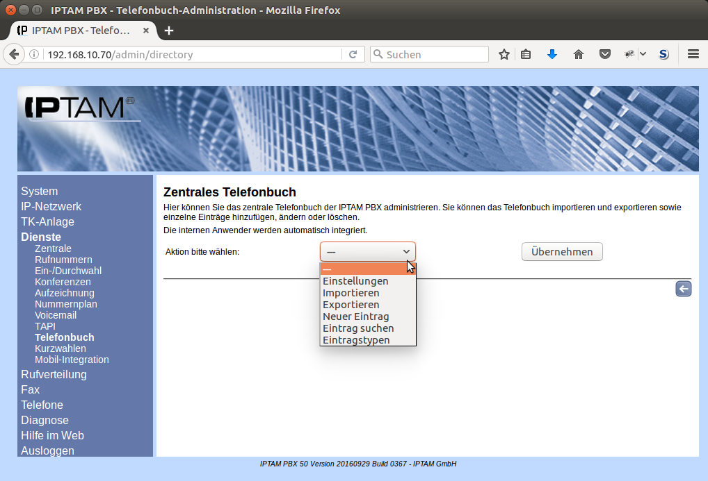 Das zentrale Telefonbuch kann importiert oder exportiert werden. Einträge können hinzugefügt oder verändert werden. Um eingetragenen Namen mehrere Rufnummern zuordnen zu können, besteht die Möglichkeit „Eintragstypen“ zu definieren. So können z.B. geschäftliche von privaten und mobilen Telefonnummern unterschieden werden.