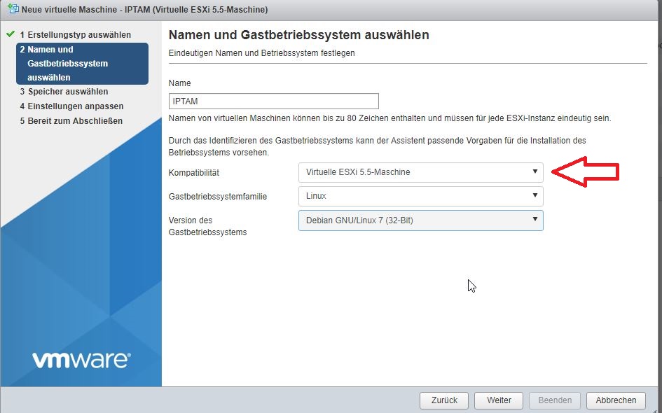 Image Image Die Lösung setzt bereits beim Erstellen der virtuellen Maschine an. Ggf müssen Sie die Installation also wiederholen. Wählen Sie beim Erstellen der VM die Kompatibilität auf „Version 5.5 oder niedriger“. Dann wird Ihnen die Möglichkeit geboten, bei der Auswahl des zu installierenden Betriebssystems die Auswahl „Debian 7 (32 Bit)“ zu treffen.