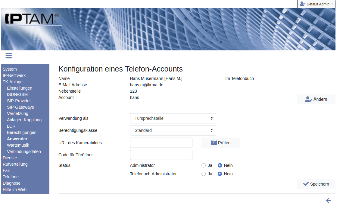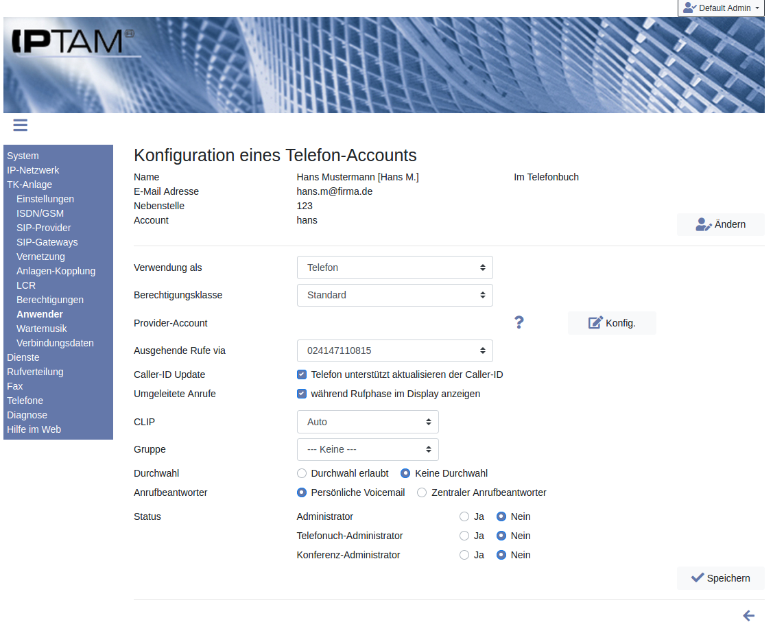 Das Auswahlfeld „Durchwahl (MSN)“ ist nur vorhanden, wenn in Ihrer IPTAM PBX mindestens einen ISDN Mehrgeräteanschluss eingerichtet haben. Sie können dann in diesem Auswahlfeld festlegen, ob diesem Anwender eine der vorhandenen MSNs zugewiesen werden soll.