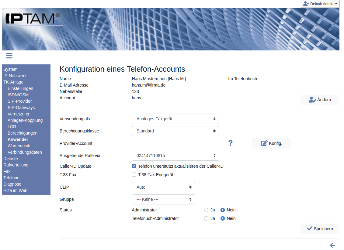 Das Auswahlfeld „Durchwahl (MSN)“ ist nur vorhanden, wenn in Ihrer IPTAM PBX mindestens einen ISDN Mehrgeräteanschluss eingerichtet haben. Sie können dann in diesem Auswahlfeld festlegen, ob diesem Fax-Gerät eine der vorhandenen MSNs zugewiesen werden soll.