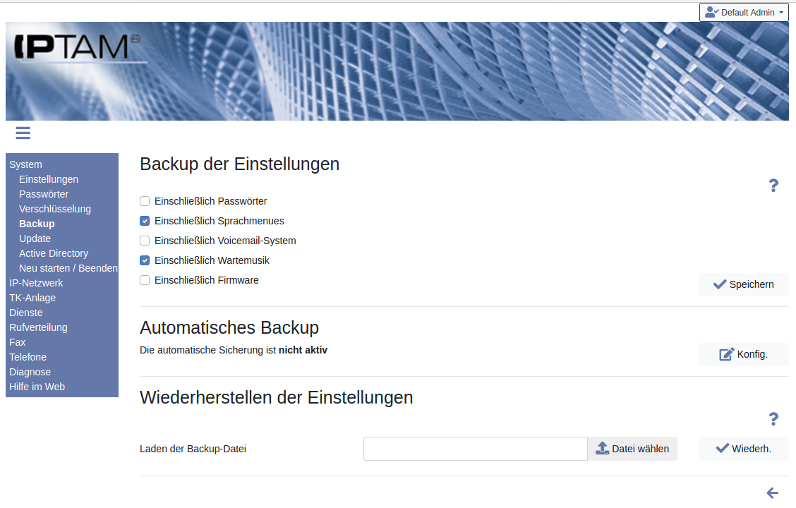Image Unter System►Backup können Sie alle in der IPTAM® IP-Telefonanlage vorgenommenen Einstellungen in einer Datei speichern und bei Bedarf in der selben oder einer anderen IPTAM® IP-Telefonanlage wieder einspielen. Wie in der Abbildung zu erkennen ist, können Sie beim Backup festlegen,