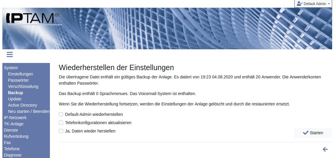 Wenn Sie das Kästchen „Default-Admin wiederherstellen“ aktivieren, können Sie sich nach dem Einspielen des Backups wieder mit dem Default Admin anmelden. Dies ist dann sinnvoll, wenn Sie sich nicht sicher sind, welches Passwort sie für einen Administratoraccount in dem Backup vergeben haben, das sie gerade einspielen wollen.