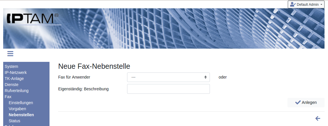 können Sie neue Fax-Nebenstellen einrichten. Es öffnet sich dann die in der nebenstehenden Abbildung dargestellte Eingabemaske. Über das Auswahlfeld „Fax für Anwender“ können Sie einen in der IPTAM