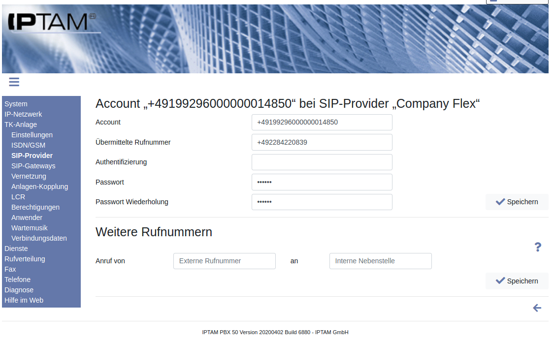 Nach dem Anlegen des Accounts erweitert sich die Maske im unteren Bereich um die Möglichkeit, weitere Rufnummern zu ergänzen. Tragen Sie hier ggf. weitere Rufnummern ein. Dies können z.B. portierte Rufnummern von Mehrgeräteanschlüssen sein. Eine Beschreibung der Parameter finden Sie im Abschnitt zu SIP DDI Account.