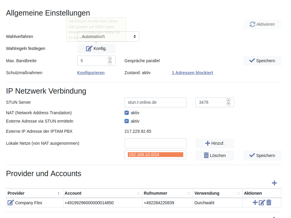Bei „Lokale Netze (von NAT ausgenommen)“ tragen Sie das lokale Netz der Telefonanlage ein (z.B. 192.168.10.0/24, (Hinweise dazu). Ggf ergänzen Sie weitere Netze (z.B. wenn Sie Telefone via VPN an der IPTAM® PBX betreiben).