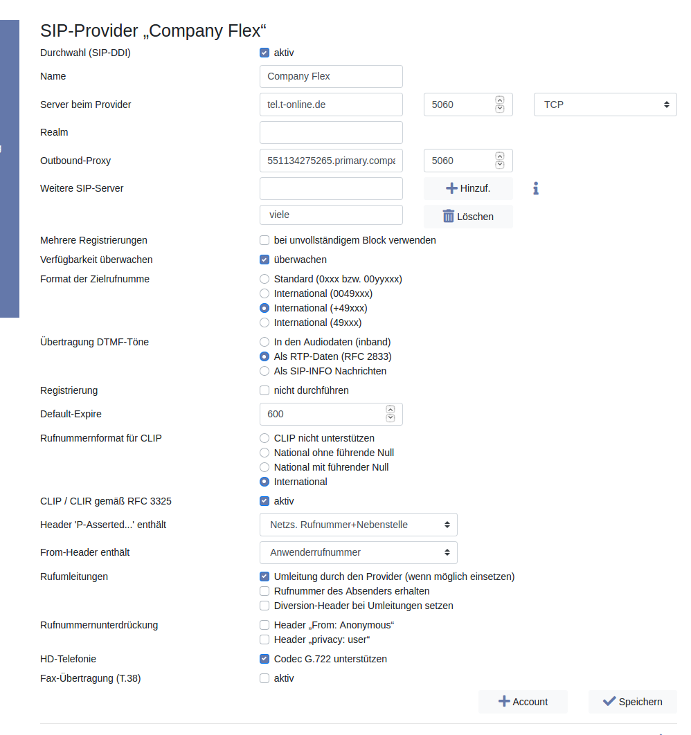 Bei Account tragen Sie die „Registrierungsrufnummer“ im internationalen Format so ein, wie Ihnen Ihr Provider dies mitgeteilt hat. Bei Rufnummer tragen Sie die Rufnummer im internationalen Format ein (Stammrufnummer ohne Durchwahl). Beim Passwort tragen Sie das Passwort ein, das Sie von Ihrem Provider Deutsche Telefkom AG mitgeteilt bekommen haben. Es kann auch im Kundencenter konfiguriert werden.