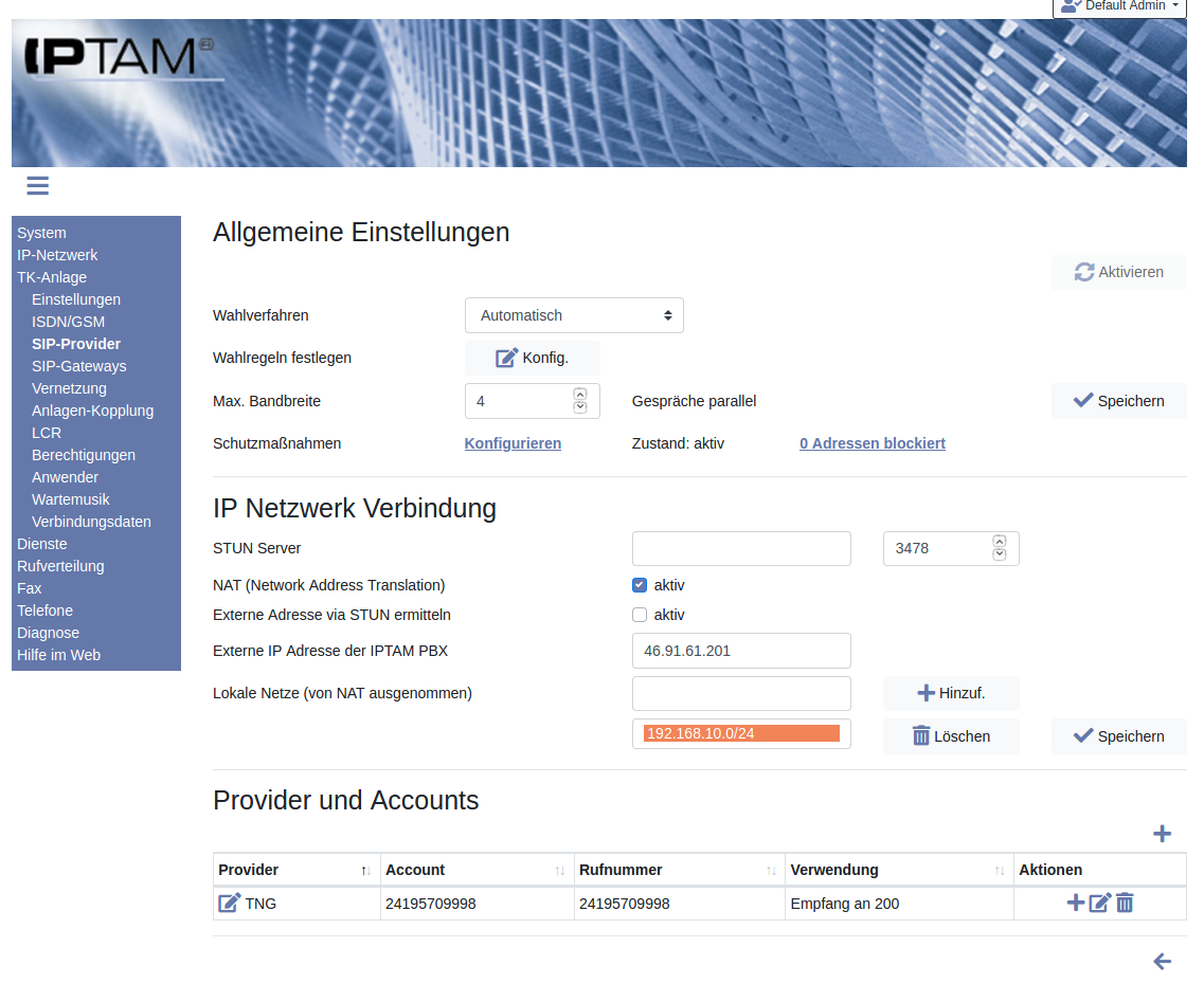Der Provider TNG konfiguriert die SIP-Anschlüsse in der Regel so, dass Anrufe aus dem eigenen Ortsnetz ohne Ortsnetzkennzahl übergeben werden. Bitte informieren Sie TNG, dass die Anrufe ungekürzt übergeben werden, da die IPTAM@ PBX die Anrufe sonst nicht korrekt annehmen kann.